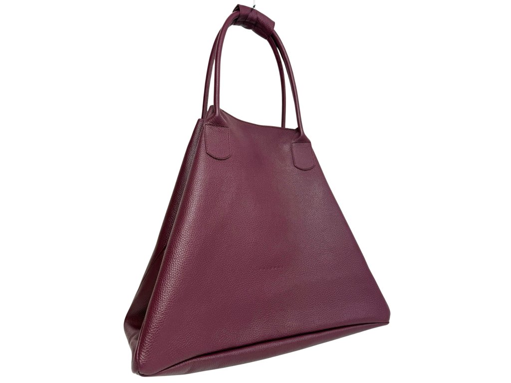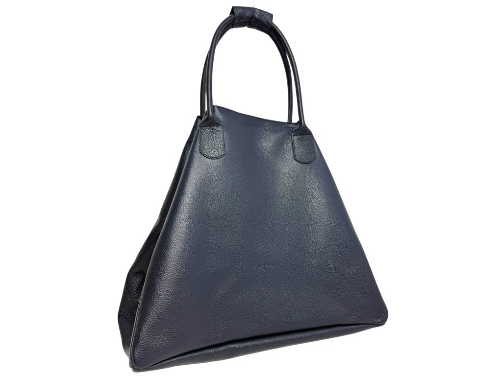 Prostorná dámská kožená kabelka trojúhleníkového tvaru se zipem. Pro lepší přehled věcí, které nosíme uvnitř, je vybavena o široké dno. Kabelka disponuje dostatečně dlouhými uchy pro pohodlné zavěšení na rameno. Ucha jsou vybavena o kožený pásek se dvěma patenty.