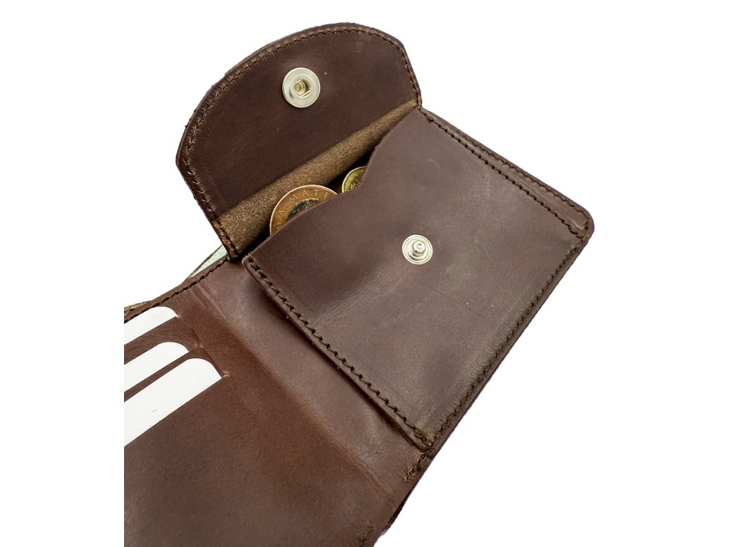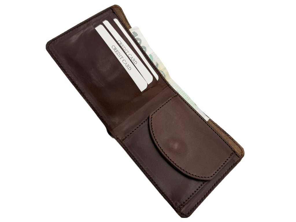 Pánská kožená peněženka — elegantní a pevná peněženka z pravé kůže, ideální pro každodenní nošení. Kompaktní rozměry 11 × 9,5 × 1 cm se pohodlně vejdou do kapsy. Uvnitř praktická přihrádka na drobné a bankovky, dále 3 přihrádky na karty. Precizní prošití a kvalitní materiál zaručují dlouhou životnost.
